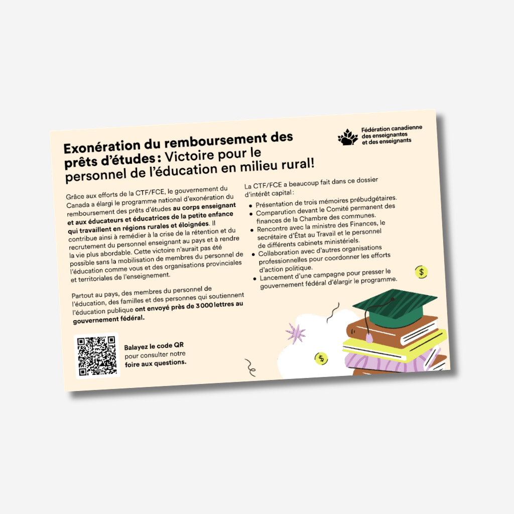 Dans son budget de 2024, le gouvernement fédéral s’engage à élargir l’exonération du remboursement des prêts d’études canadiens au personnel enseignant et aux éducateurs et éducatrices de la petite enfance de régions rurales et éloignées.