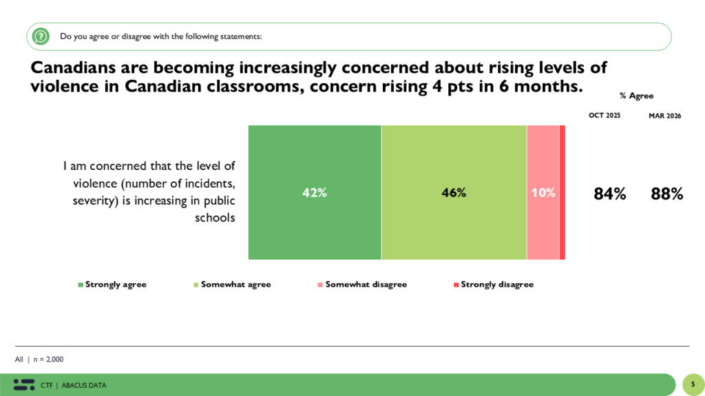 For the last three years, Abacus Data have been tracking Canadian public opinion on public education on behalf of the Canadian Teachers’ Federation (CTF/FCE). The latest results, from a national survey conducted March 17 to 23, 2026, among 2,000 Canadian adults, show that concern about violence and aggression in public schools remains widespread — and is rising.