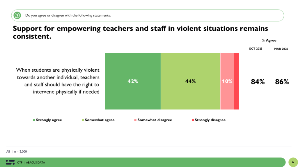There is also strong support for giving teachers and staff the authority to respond in situations involving physical violence. While this measure has changed little since October, the consistency of support is notable: Canadians appear to recognize that school staff need to be able to act in moments where safety is at risk.