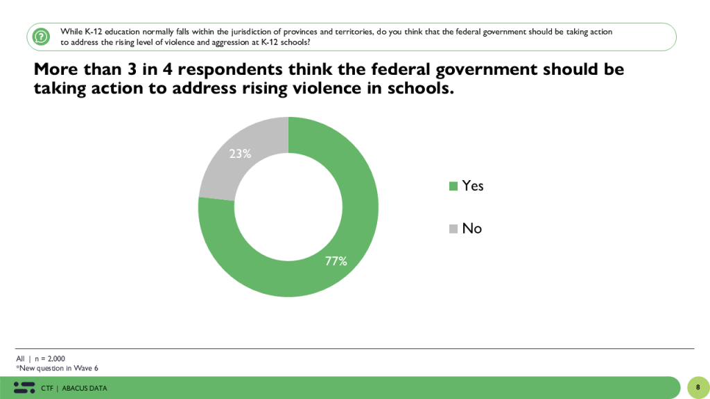 Although K-12 education falls primarily under provincial and territorial jurisdiction, Canadians do not believe that should prevent action from other levels of government. More than three-quarters say the federal government should take action to address rising violence and aggression in K-12 schools.