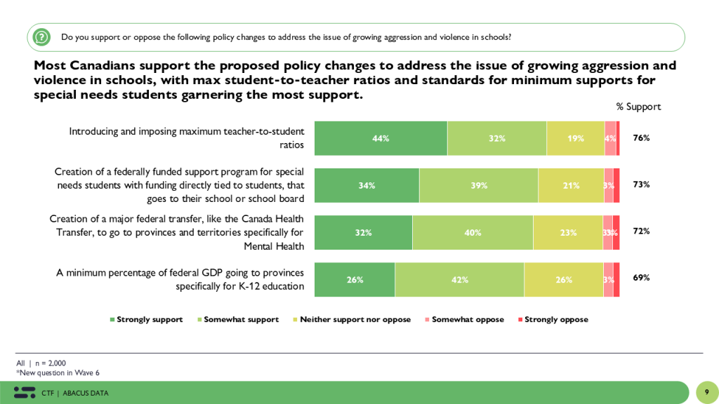 The most popular proposal is introducing and imposing maximum teacher-to-student ratios, supported by 72% of Canadians. There is also broad support for establishing minimum supports for students with special needs through a federally funded support program (73%), creating a major federal transfer to provinces and territories specifically for mental health (76%), and committing a minimum percentage of federal GDP to provinces and territories for K-12 education (69%).