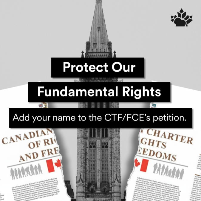 The Canadian Teachers’ Federation (CTF/FCE) Board of Directors passed a motion that the CTF/FCE lead the coordination of a House of Commons petition, calling upon the Federal Government to condemn and take action to restrict the usage of Section 33 of the Canadian Charter of Rights and Freedoms when used to deny workers their collective bargaining rights and to deny human rights.