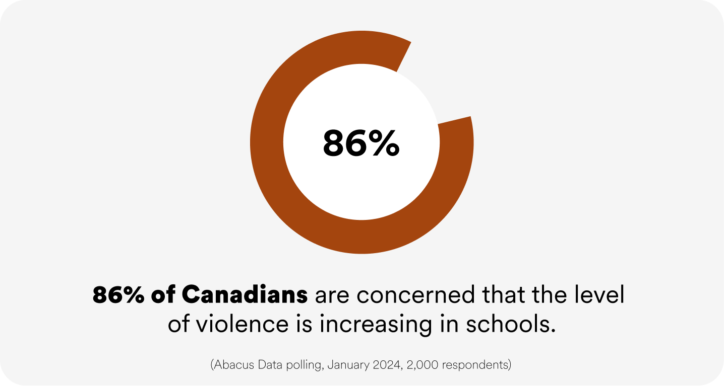- 86% of Canadians are concerned that the level of violence is increasing in schools. (Abacus Data polling, January 2024, 2,000 respondents)