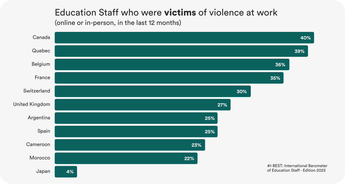 - Canada and Quebec (polled separately for this survey) rank 1 and 2, respectively for educators reporting that they have experienced or witnessed verbal violence in the workplace. (The International Barometer on Education Staff, Edition 2023, 26,281 respondents from 11 jurisdictions)
